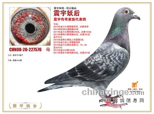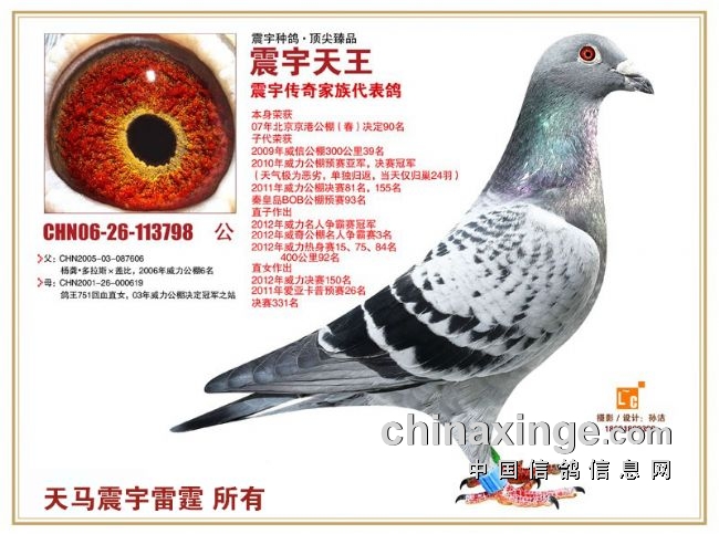 “震宇天王X震宇妖后”黄金组合,后代赛绩超群,早期最具代表性的就是,西安威力赛鸽公棚“预赛亚军”“决赛冠军”,近几年培育出了“天王继承人1号”“震宇佳人”“王太子直子”“月亮女神”“天王继承者——熊二”“石斑木玉”“芙蓉妹妹”“威力格格”“黑小子”等等可以延续血脉的种鸽优秀个体。