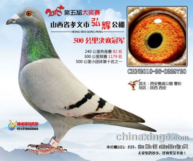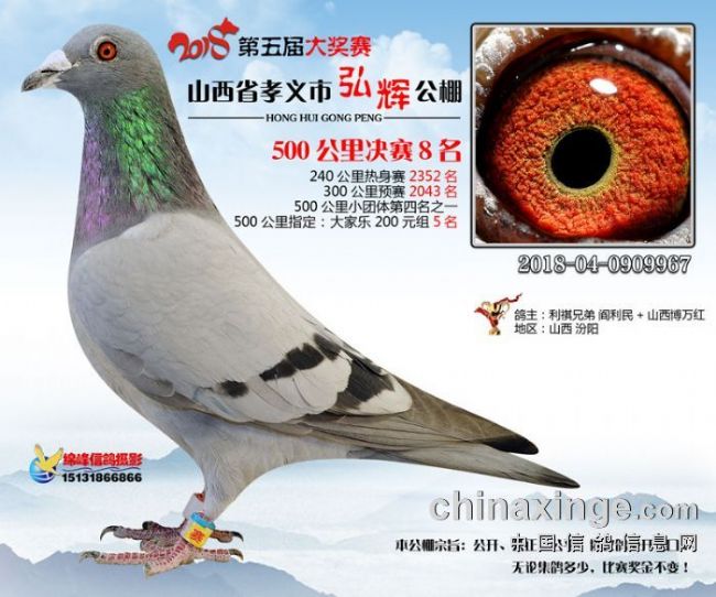 五千年文明看山西,山西之缩影看孝义,孝义之好鸽看弘辉,弘辉之战鸽已就位!山西孝义弘辉2018年第五届秋季大奖赛获奖鸽拍卖会定于11月26日在孝义市吉庆大酒店举行,同时,还将在25日晚举办隆重的颁奖晚会。届时名家齐聚共同赏鸽、拍鸽,定是一番别样风景!而为了给广大鸽友提供更便捷的服务,公棚联合中国信鸽信息网特别推出“现场与网络同步竞拍+视频直播”服务,让鸽友足不出户看直播、竞拍好鸽!