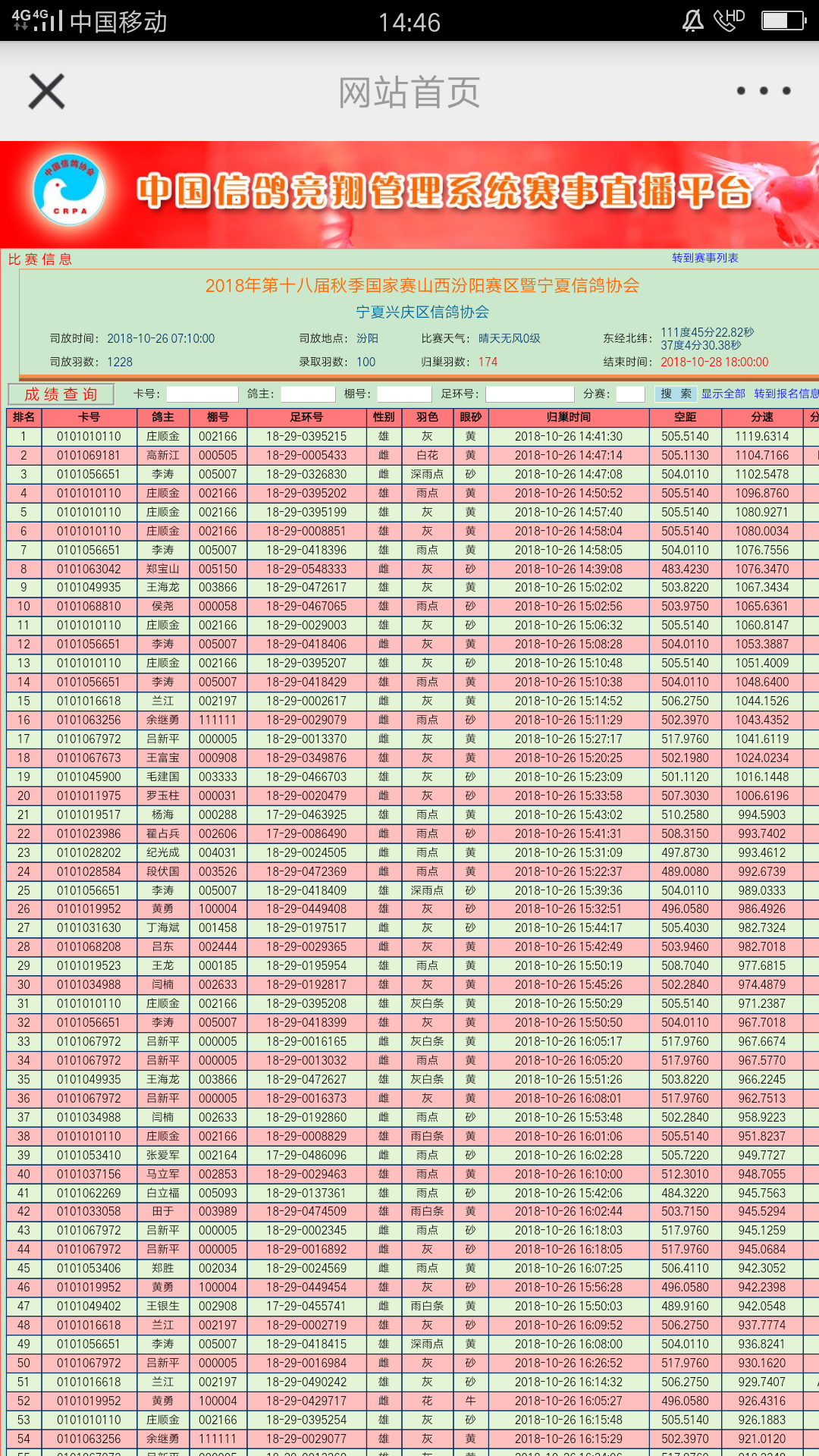 庄老师赛后告诉我说,他当时的想法就是:“要为荣誉而战斗,成也萧何,败也萧何”。做为一名赛鸽人,能够在汾阳国家赛中的数万羽中取得好成绩,一战成名是一件多么光彩的事情,这也是自己养鸽多年以来的夙愿,即使冒着全军覆没的风险也不所不惜,因此忍痛将这16羽身经百战的爱将全部送上了战场,真没有想到它们这么争气,最终为自己夺得了前十进四的骄人赛绩,这让自己很欣慰也很满足。