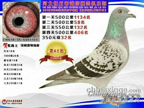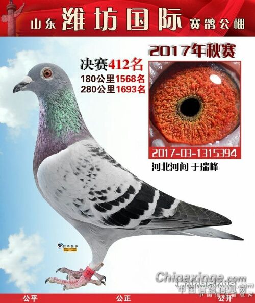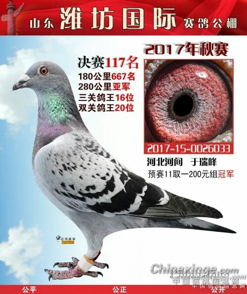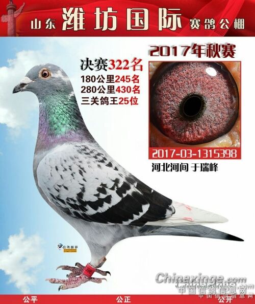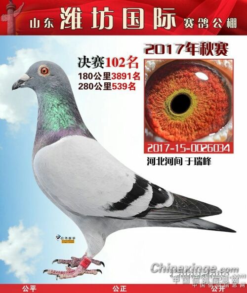 我是个养鸽子的新手,在鸽界所谓的雏。2017年在山东潍坊国际公棚交了四羽赛鸽全部进奖,而且300公里还获得了高位奖(亚军),决赛获得了102名、117名、322名、412名。2017年我是特别高兴,所有获奖鸽全部拍回来了,就是为了扩充种鸽群。