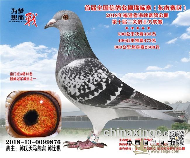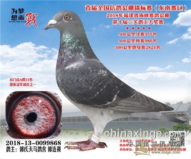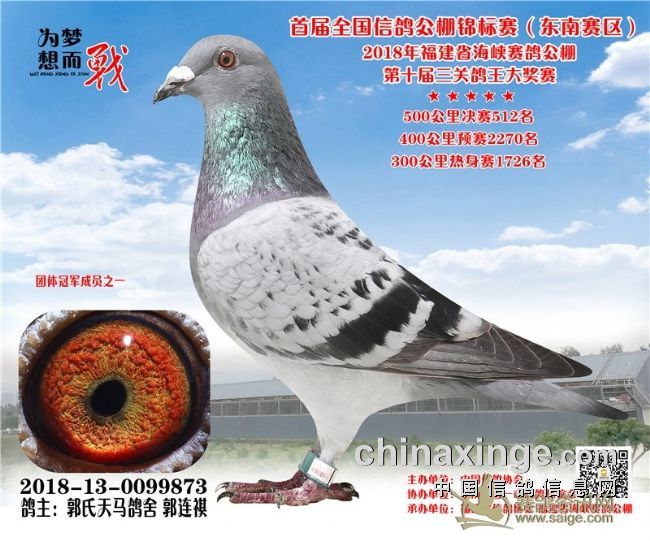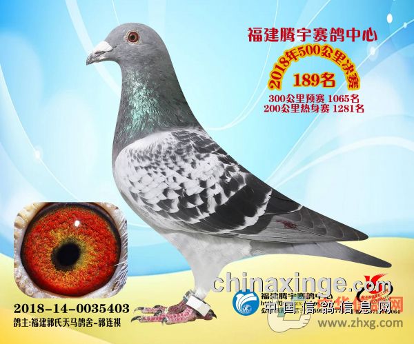 对于中国鸽友来说,有参加公棚都会先选择参加自己本省的公棚,因为有地利之便优势!从我们参加公棚赛开始,福建先后有过5个公棚,如果要更早之前,福建有石狮环球国际公棚,还有海峡的前身公棚。我们开始参加公棚,首次参加公棚赛是从参加福建海峡赛鸽公棚开始,还是和鸽友联合参赛的,送了4羽鸽入赏1羽136名,归巢1羽500多名,136名拍卖回来以后我给它取名“奔腾号”,作育出多羽高位成绩种鸽。12年开始海峡公棚之上,多参加了福建的浩宇公棚和腾宇公棚,海峡公棚1羽入赏232名,浩宇2羽缴费参赛,入赏了1羽57名, 57名郭氏天马922我给它取名“天马传承”,“天马传承”连续这么多年给鸽舍作育出三十多羽成绩鸽,好几羽超级种鸽。腾宇公棚12年一羽参赛鸽预赛39名,决赛740名,加强赛86名。13年参加福建海峡、福建腾宇、福建浩宇均是小羽数,海峡公棚3羽参赛入赏1羽218名,腾宇公棚2羽参赛入赏1羽101名,浩宇公棚6羽参赛3羽进入名次,预赛的150名决赛206名 ,预赛71名决赛277名,预赛66名决赛383名。