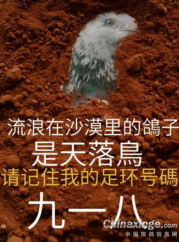沙漠这里的夜晚静悄悄,突然,说来就来了,强沙尘瀑来了。我们沙漠里的新家被三尺厚的沙土覆盖,我亲自体验了人间的诗词“在天愿作比翼鸟,在地愿结连理枝”。此刻,我更想我的家,上海、南京、北京、朝阳……。我祈求我的主人,祈求天下鸽友永远记住我的足环号九一八。九一八是一只悲惨的鸽子,离开了我的家乡,深埋在新疆的沙漠里,流浪!流浪!流浪……