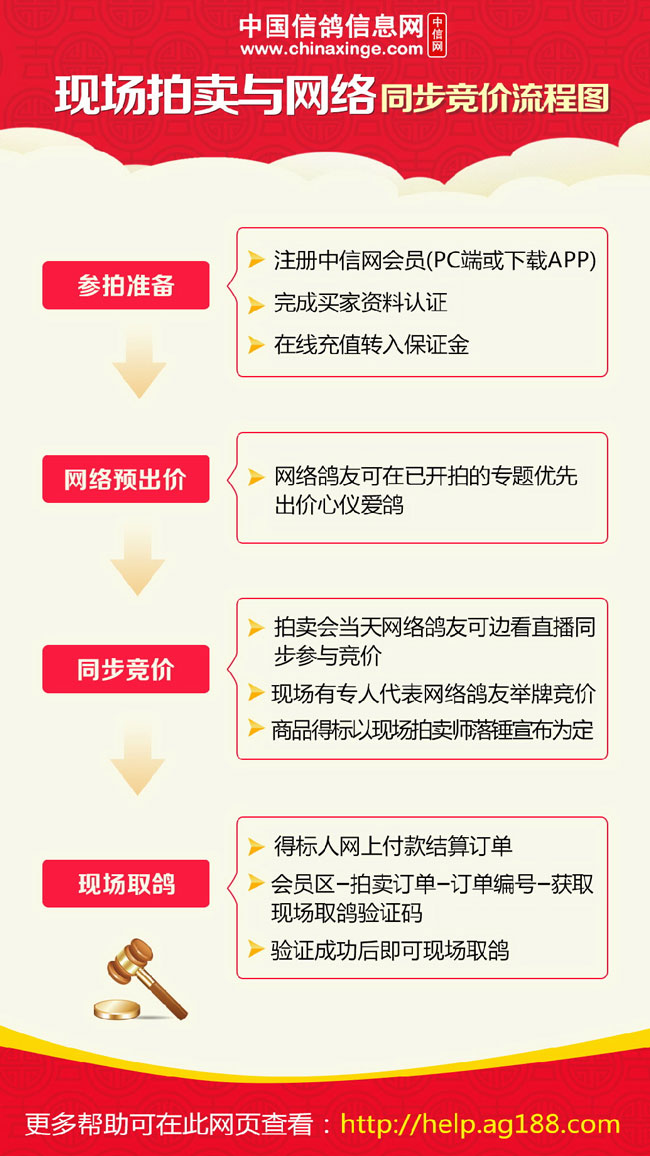 现场取鸽(推荐):1、登录会员区结算订单;2、查看订单编号,点现场取鸽按钮,获取订单取鸽验证码,系统会自动发送手机短信到拍卖会员指定手机;3、把验证码报给公棚工作人员,验证成功;4、交接拍卖鸽,签收发放取鸽凭证。→现场取鸽详细流程