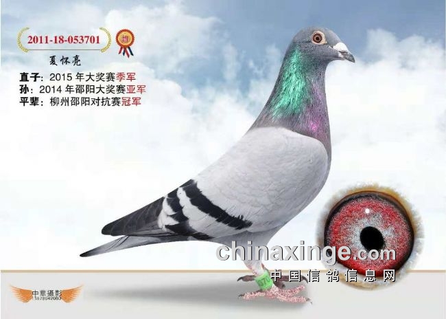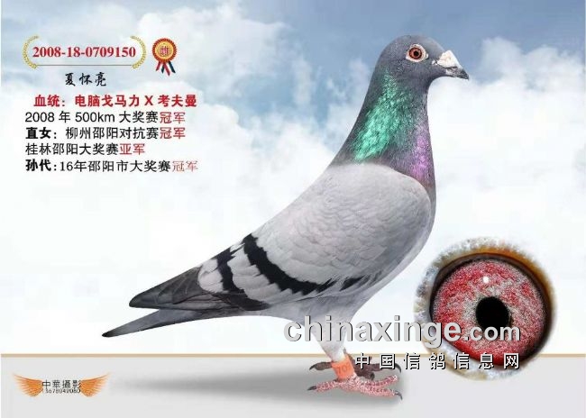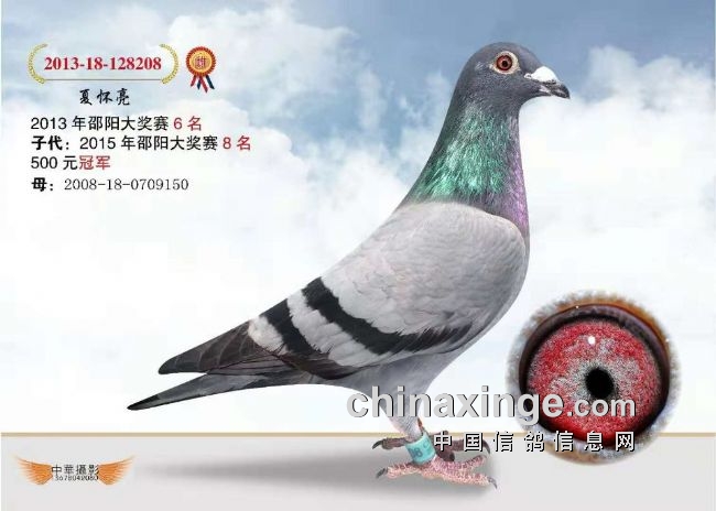 夏怀亮的:2008-18-709150雌、灰、砂赛鸽,是邵阳市2008年市500公里幼鸽大奖赛的冠军,这羽2008-18-0709150冠军(简称“冠军150”),表现出了超强的遗传性。