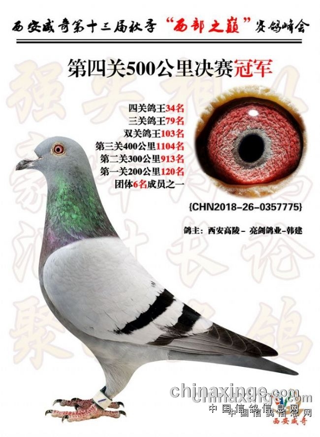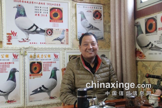 韩建年轻时去南方打工,之后喜爱上了赛鸽运动,就回到了家乡专门养鸽子打比赛,以鸽养鸽。十年前,拍公棚获奖鸽遇到了两羽好鸽子,命名为“亮剑至尊”2007-01-4217709雄和2009-27-019599雌,可以说这个黄金配对成就了他近八年来的辉煌,直至夺得西安威奇公棚决赛冠军。