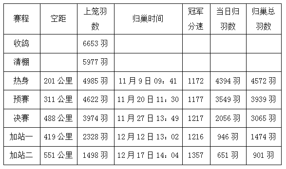 11月27日,万众瞩目的488公里决赛打响,3974羽赛鸽争夺冠军宝座。在经历了6个多小时的艰难飞行后,孙国忠+唐礼芳的一羽环号为18-01-1408705的灰鸽率先于13:49:36归巢,分速1217.0798米/分,荣登冠军宝座。2秒后,羽轩鸽舍-王伟的一羽18-32-0284766灰鸽紧随其后,以1216.9755米/分的成绩赢得亚军称号。13:49:39,李建的一羽18-12-0228408红楞不甘示弱,快速入棚,夺得季军。最终,决赛共计归巢3065羽,归巢率高达77.13%,成绩夺目。
