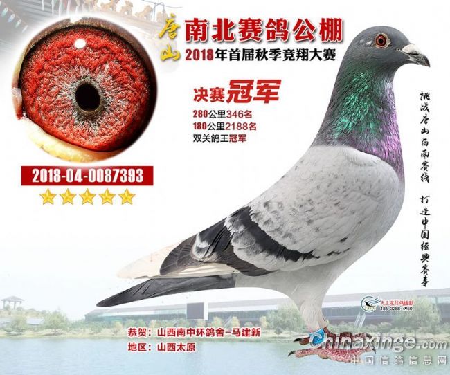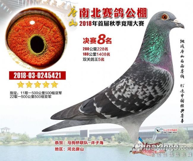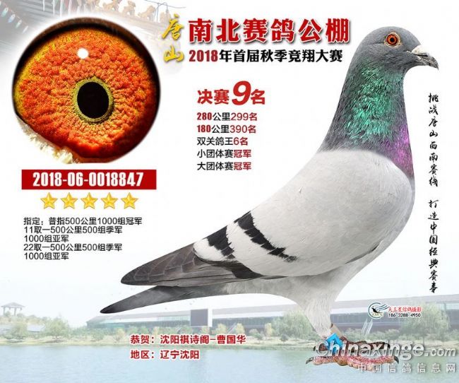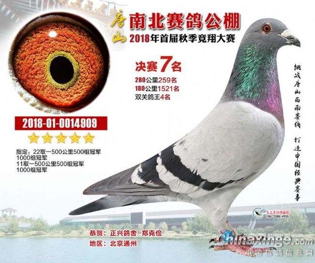 唐山南北公棚2018年定于12月31日举行颁奖及获奖鸽拍卖大会,参加拍卖的除了突破极限的52羽决赛精英之外,唐山南北鸽业还特别为本次拍卖会提供117羽优秀种赛鸽助兴。这些优秀种赛鸽均为南北鸽业近几年各大赛场的获奖鸽及获奖鸽的父母,北京开创者俱乐部获奖鸽的平辈及子、孙代,品质上乘,皆善实战!