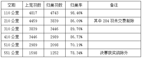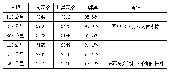 10月5日,第一站3公里路训,此3公里短训了两次,10月10日第三站6公里短训,之后接着进行了11次短训,直至11月9日赛前最远距离110公里短训,本次短训计有3944羽鸽子参加,最终有3736羽进入第一关比赛。等于从查棚起至12站短训结束,损失鸽子1401羽,存棚率72.73%,完全打破了“收费前、当鸡养;收钱后,对半丢”的公棚常态。今年的四关大奖赛,陕西壹佰再度交上满意答卷,四关平均归巢率超86%,再一次证明了其养功的扎实。