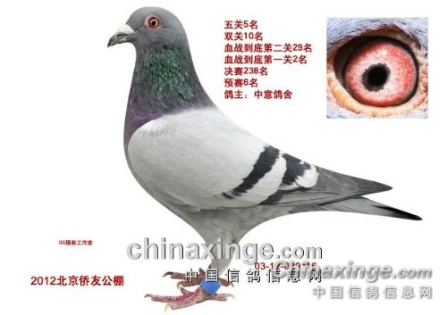 09年秋季,一羽佩戴05脚环的雨点白条雌鸽,鸽主内蒙古包头温氏鸽业,参加北京爱亚卡普公棚比赛,在状态不佳的情况下,沦为天落,被慧眼识英雄的磁县中意鸽舍收留。12年配中鑫公棚108名(血统侨友名鸽詹森456配麦克斯血统)雄鸽,作出两羽灰鸽,一雄一雌。雄灰砂送北京侨友获北京侨友预赛6名、决赛236名、血战到底五关鸽王5名!雌深灰黄眼,送河南郑州中鑫公棚获4关鸽王总冠军!