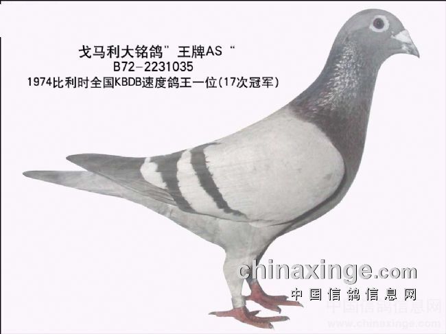 大铭鸽“王牌AS”,环号BE72-2231035,灰雄。是戈马力·佛布鲁根以超人的胆识,在同村摩利斯·万德维尔德(Maurice Vandevelde)的拍卖会上买回来的传奇种鸽。