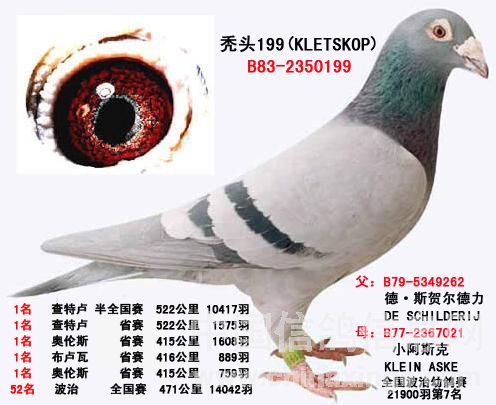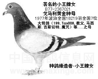 以“小王牌女”B77-2367021为例,该鸽本身曾获77年波治全国18219羽7位,与超级种公B79-5346262相配,堪称戈马力·佛布鲁根先生的黄金配对,号称“魔幻组合”,造就出世界大名鸽B83-2350199“秃头号199”。