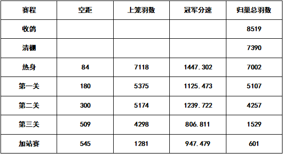 2018年12月13日,徐州徽商180公里热身赛震撼打响,7118羽参赛鸽竞逐冠军宝座,最终95%羽参赛鸽凯旋,为本届比赛开了一个好头,赢得开门红!12月18日,300公里预赛在江苏南京黄栗墅服务区打响,5174羽参赛鸽再次披挂上阵,历经多番训练的参赛鸽展现出超凡实力,用高达82%的归巢率证明主人和公棚平日里付出的努力没白费。12月28日,经过近10天休整的4298羽参赛鸽开始最后的角逐,500公里决赛实际空距还要多9公里,历经千辛万苦,至第二天一早,左权的2018-12-0087941参赛鸽率先归巢,领先亚军近20分钟,斩获决赛冠军;张家启(大1)、瑞翔阁-李宗善(大1)的参赛鸽在同一分钟内先后归巢,分居亚军、季军。
