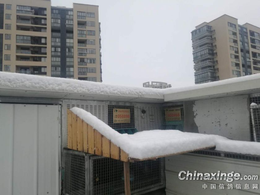 棚里的情况不比家里过下蛋的下蛋,煽情的煽情。小小的鸽棚里蕴酿着此起彼伏的能量。远远的在楼下就能听到浑厚的中音,鸽们在这个春回窄寒的日子里尽情的享受着配对带来的喜悦与兴奋。前天晚里下了一场雪,一场大雪。短短的后半夜居然让雪的厚度到达的十几公分,早上起来,满目的白雪。上得棚来,更是大雪压鸽棚,放出鸽去,飞在白茫茫的天际,正在欣赏之余来了不速之客,一只大鹞子不请自来,闯入鸽群。这边的鹞子还没有看到如此穷凶极恶之徒,不一会二十一羽鸽子不见了踪影,有一只还停在了对面人家的平台之上。忐忑不安的等待着鸽群的归来,过了一个多小时才回来几只,而可恶的鹞子居然还在小区上空盘着,由于中午要出去吃转转宴,不能久等,到俺离棚之时还差三羽末归,两绛一黑。结果俺第二天大早上棚时还有一只绛在刚刚落到棚上,一进棚,一点,独独差了俺最喜欢的19年春季南北飞特比小黑雌。这家伙是俺最看好最喜欢的一只,平时当宝贝一般对待,也许正应了哪句娇娇者易折的话吧!时至目前小黑雌还是末归,看来凶多吉少了……