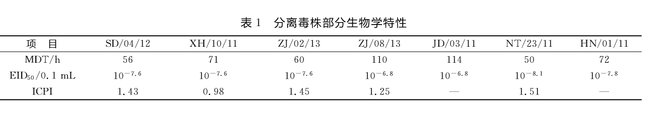 2.1 病毒的分离鉴定经尿囊腔接种病料上清的第一代SPF鸡胚均不死亡,且无HA效价,盲传1代后7株分离毒均有HA效价。分离毒株均可被ND阳性血清所抑制,而不能被H5、H9亚型禽流感病毒阳性血清抑制。7株分离株部分生物学特性(表1)。
