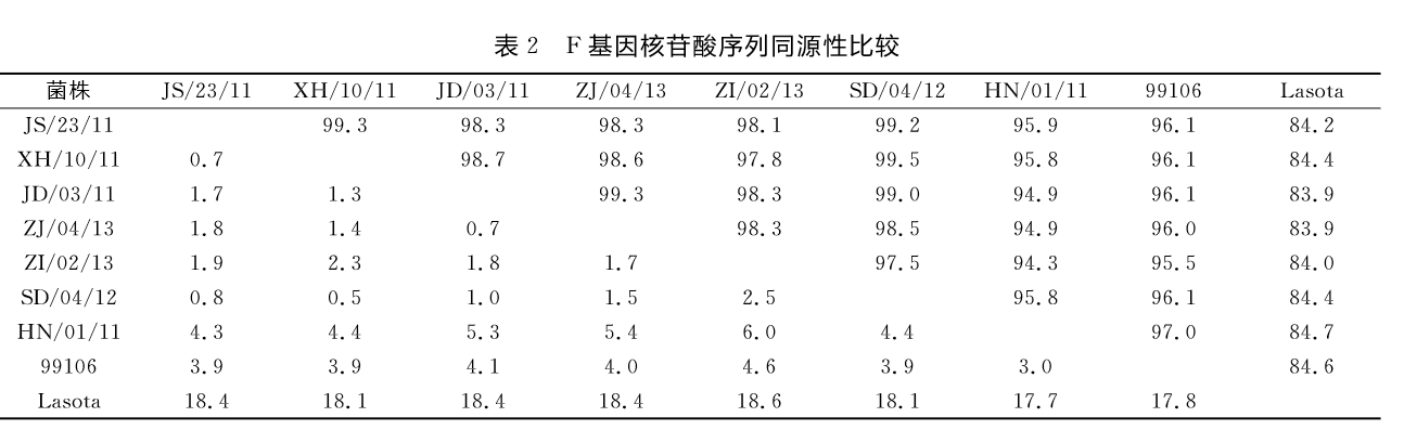 2.2 F基因的扩增及序列测定与遗传进化分析用NDV通用引物扩增F基因片段,可获得1700bp左右的条带,使用MeaAlign软件比较7株分离株F基因的同源性,可以发现,本研究中7株分离毒同源性较高,江苏、浙江、山东分离株的核苷酸序列同源性在97.5%~99.5%之间;而7株分离株与我国广泛使用的疫苗株Lasota相比,核苷酸序列的同源性为83.9%~84.7%(表2)。