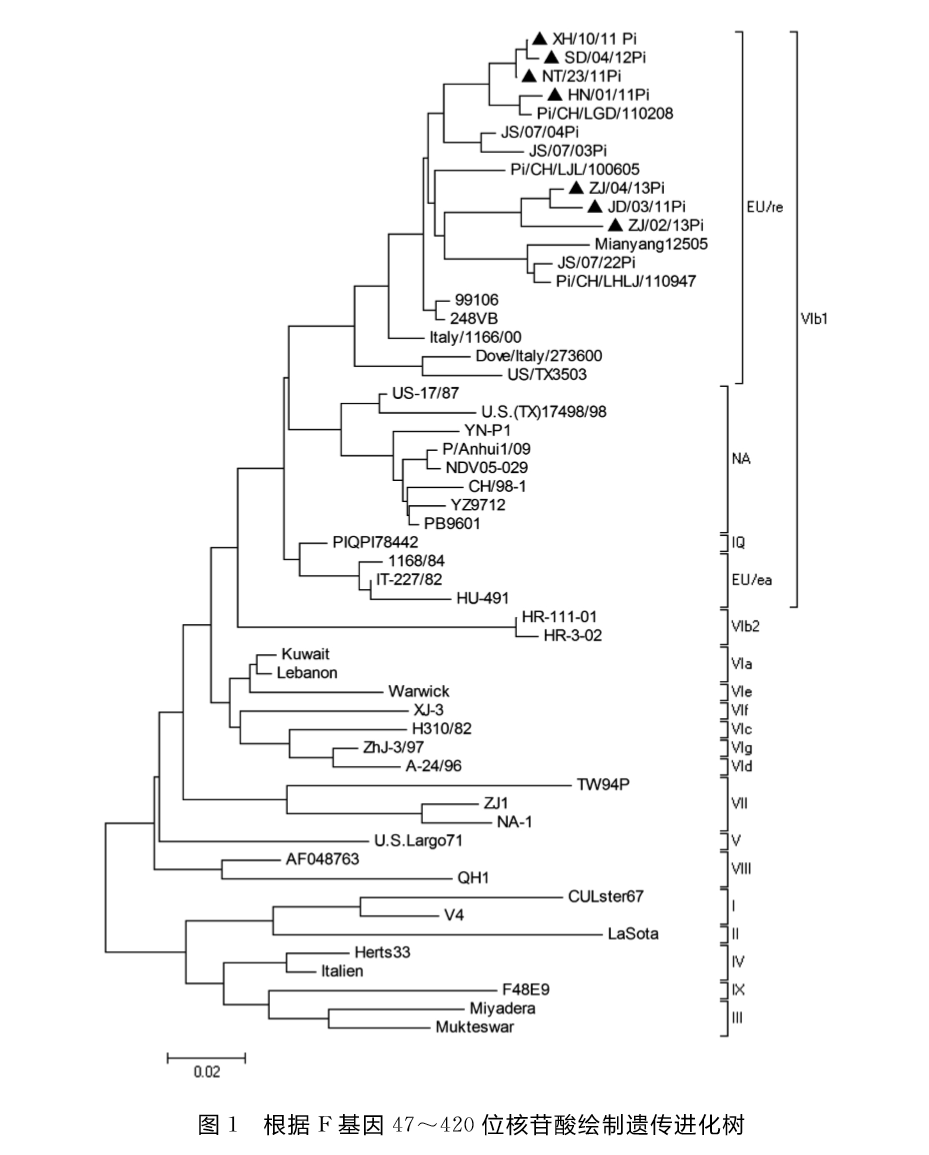1.6 病毒F基因片段的序列分析测序后以基因分析软件DNAStar和MEGA5分析测序结果,将这7株所测定的分离株的F基因序列与其他在GenBank上已有的部分NDV代表株的F基因片段作序列比较,分析F基因的同源性,并根据F基因47~420位核苷酸绘制系统发育进化树。