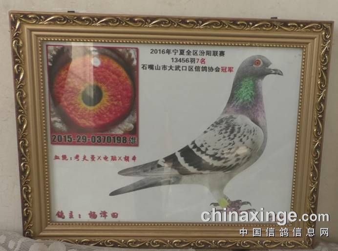 2015年第一年开始比赛便有不俗表现,在大武口信鸽协会秋赛获得冠军!2016年更是一飞冲天!2016年春季在宁夏全区联翔汾阳赛中,获得13456羽7名!49名!同时获得大武口区的冠、亚军!其中这羽49名在2015年取得300公里环县93名、440公里长武201名、500公里永寿136名、500公里铜川34名!鸽王级别的赛绩!2017年大武口信鸽协会540公里比赛三原站获得冠军!特比环冠军!近4年来在当地比赛每次都名列前茅,特比环、指定也多次获奖!