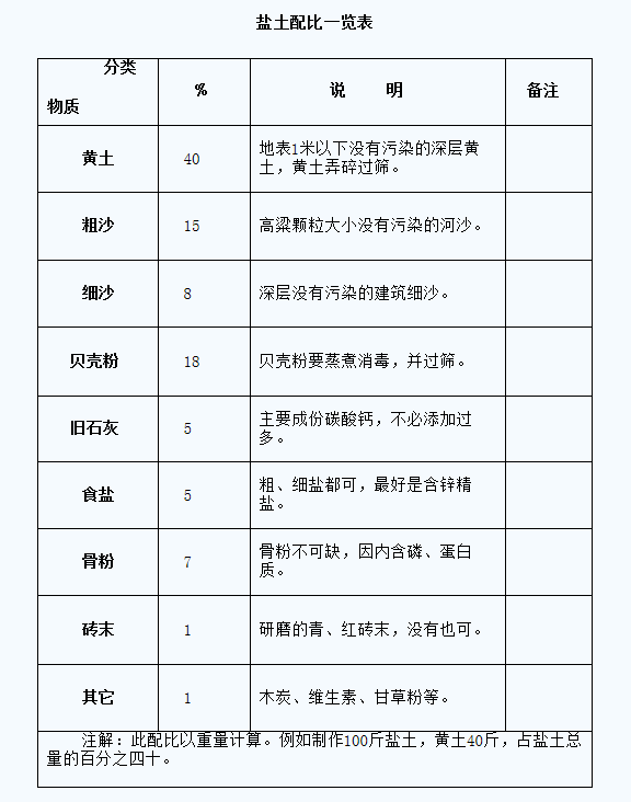 事物总是一分为二的,适者则宜,过了则反,制作盐土要精心细致。我的自制盐土配比如下:(盐土配比一览表附后)