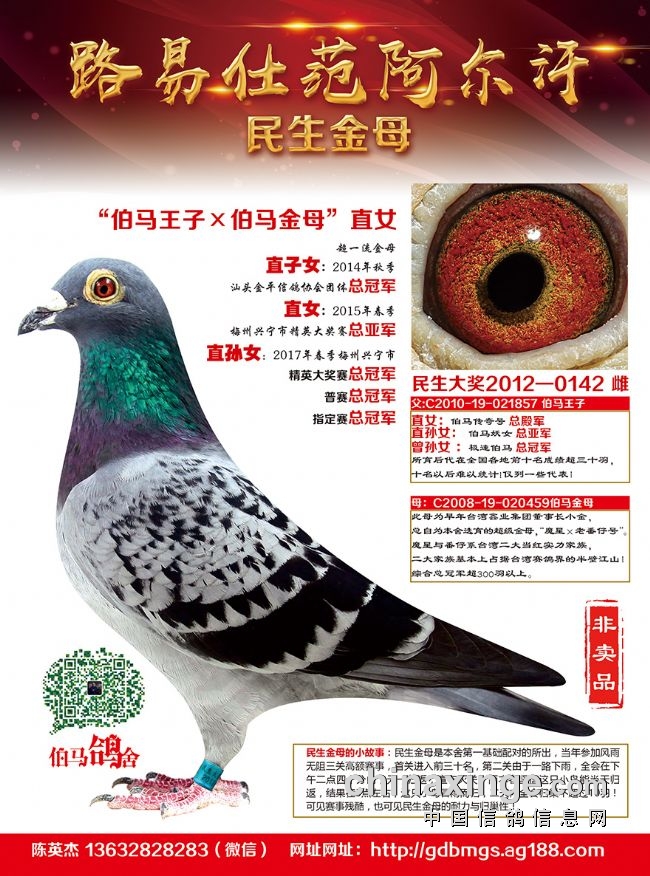 伯马鸽舍简介:占地面积400平方,总建筑面积2000平方,为商住一体化,内设客房,KTV,办公室,可以为鸽友来访提供一流的衣食住行!伯马鸽舍由本舍主人陈英杰先生于2000年创建,鸽舍位于李梅龄的家乡广东梅州,以数十羽伯马鸽为基础,掺入台湾着名品系路易仕范阿尔汗(番仔)掺杂台湾鑫业魔星为基础血统,采取亲血回交,远亲参赛的作育方式,严格作育并参赛,形成一路以“金母”(伯马金母,民生金母,钻石金母)为血系的快速稳定的鸽系,先后支援四川,重庆,辽宁,广东,福建,新疆,湖南等全国各地鸽友,悉数均获得冠军,亚军,季军等一系列优秀的成绩!