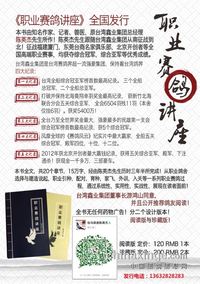 陈英杰老师及其鸽舍简介:知名赛鸽手,作家、记者、兽医,原台湾鑫业集团总经理陈英杰先生所作!陈英杰先生跟随台湾鑫业集团从南征战到北,两次站在大陆赛场最高奖!征战福建厦门,东莞台商名家俱乐部,北京开创者等全国高端职业赛事,均获夺综合冠军,综合亚军等优秀成绩。