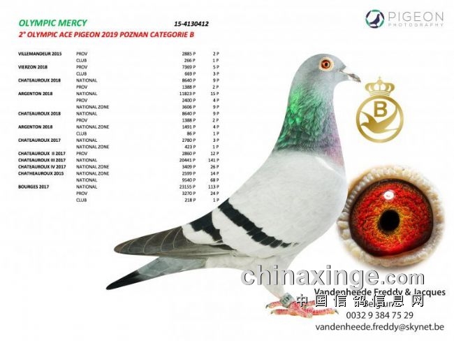 “奥林匹克太古”(Olymic Tygoo BE15-4130410)在2017年就表现出色,获得利蒙治全国9151羽51位和安古拉姆全国14937羽52位。2018年,它又赢得图勒全国4169羽7位、安哥拉姆全国4525羽12位和贾纳克全国5371羽13位。因此,它获得2019年波兹南奥林匹克C类亚军头衔,另外它还是2017和2018年全国长距离鸽王亚军和16位。