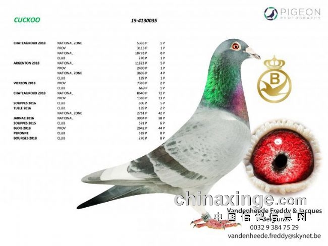 “布谷鸟”(Cuckoo BE15-4130035),三次比赛冠军,它是“新福雷迪”的直孙,祖父“新福雷迪”是“马提奥”的半兄弟,这是“布谷鸟”的成绩单: