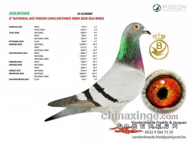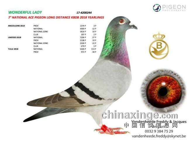 “神奇女郎”(Wonderful Lady BE17-4200244),安古拉姆全国5030羽12位、利蒙治全国7236羽27位和图勒全国5326羽113位,凭借这些出色的成绩,它取得2018年全国长距离一岁鸽组鸽王7位。