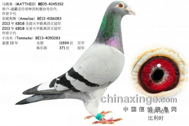 “马提奥”,直接出自帝卢-速霸龙传奇种鸽“利蒙治号”。这羽基础种鸽作育子代“安妮莉丝”(Annelise)获得全国中长距离鸽王冠军、“黄金飞狐”(Goldfixie)获得2018年全国长距离鸽王6位和2016年全国长距离鸽王14位。“马提奥”还作育子代“小汤姆”(Tommeke)获得2013年全国亚军。