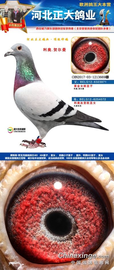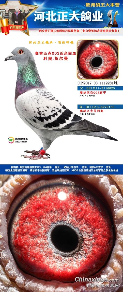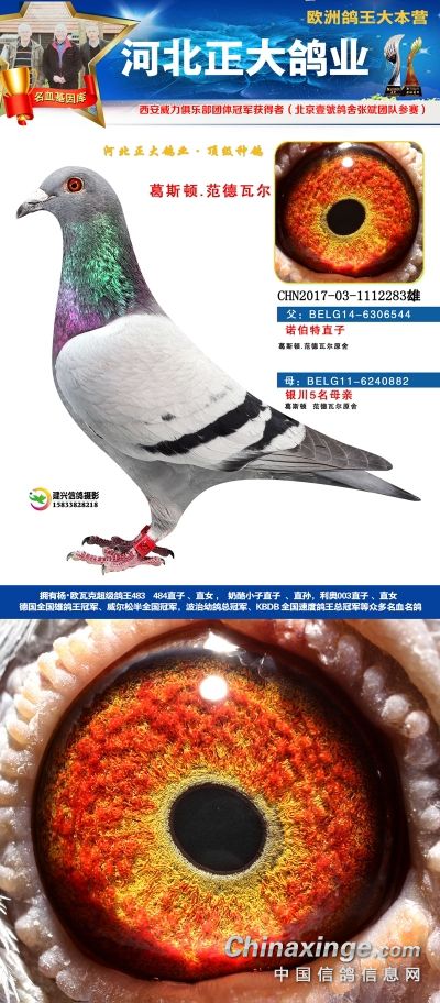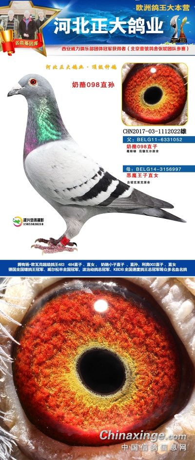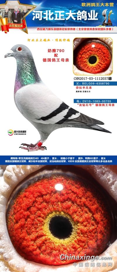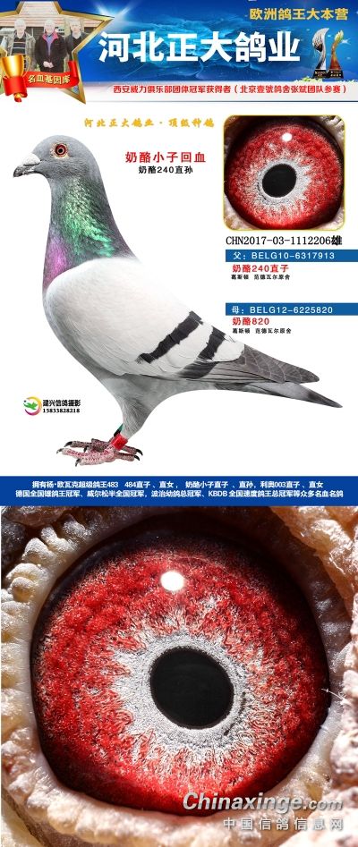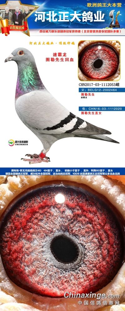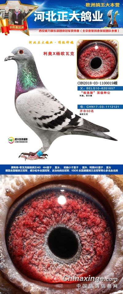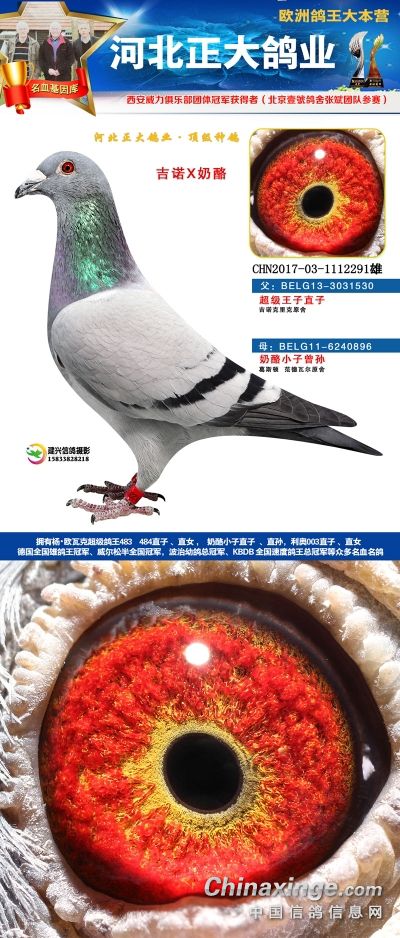 本场拍卖鸽血统有奶酪、杨欧瓦克、利奥、辈份高、血统纯的速霸龙,威力团体冠军等,欢迎大家关注。18年河北正大鸽业在西安威力俱乐部参赛,赛鸽寄养在北京壹号鸽舍张斌团队,都获得了一系列的好成绩。2018年西安威力俱乐部五关大排名鸽王9名,院内殿军(第四关院内亚军,第五关院内5名),13名,66名(第五关院内殿军)。152名,购买1组环(10枚)。获得团体冠军,赢得奔驰G63一辆,Gls500一辆。职业大师赛冠军,赢得奖金8位数!访问河北正大鸽业展厅查看更多成绩>>