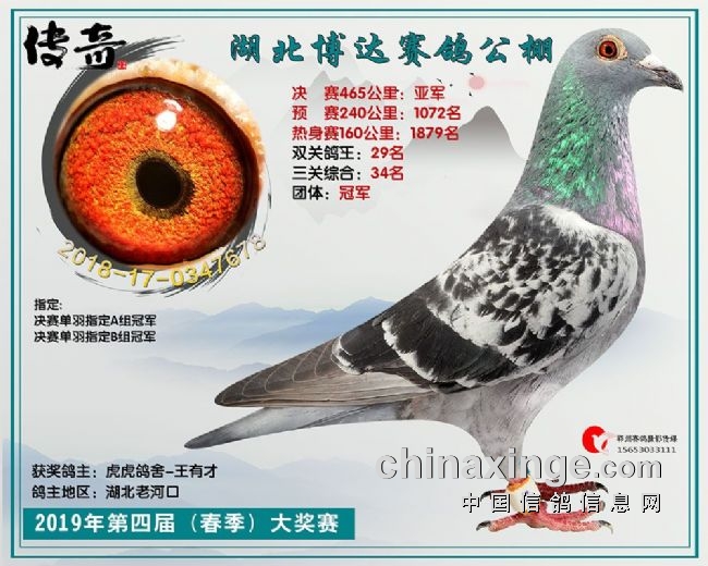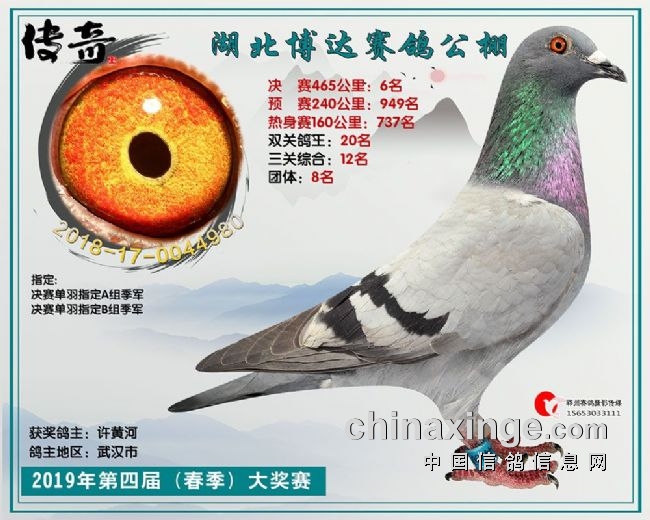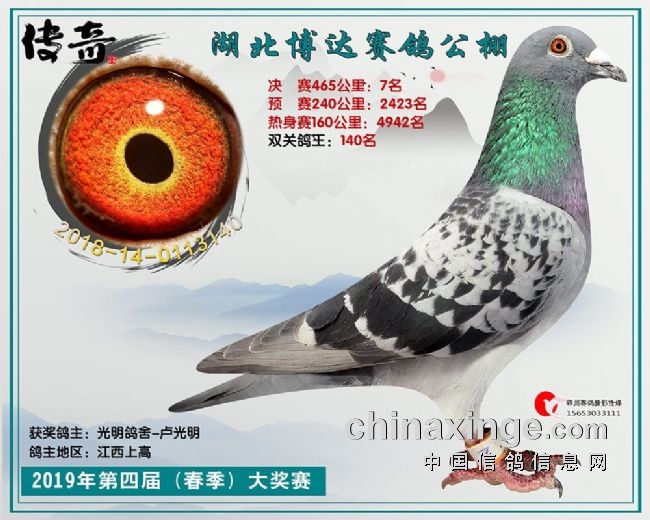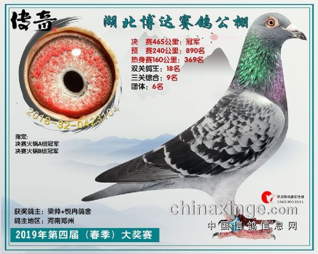 霸气增奖48万元,高归巢率交完美答卷。2019年,湖北博达赛鸽公棚第四届春赛在全国普遍阴雨天气多、归巢率不佳的情况下,清棚7368羽,决赛归巢2164羽,成功收官。公棚不仅大力举办热身赛、预赛、决赛,还一口气开启510公里飞跃黄河挑战赛,更是展示出公棚的魄力与赛鸽实力。在决赛中,真实上演了毫秒定冠亚军的激烈比拼,其中梁帅+悦冉鸽舍的一羽32-0423104雨点鸽以毫秒优势登上冠军宝座。