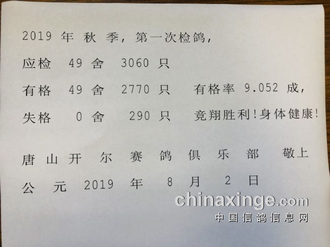 截至8月2日17:00,2019年“开尔杯”信鸽职业联赛总检圆满结束,共计检鸽2770羽,失格290羽。