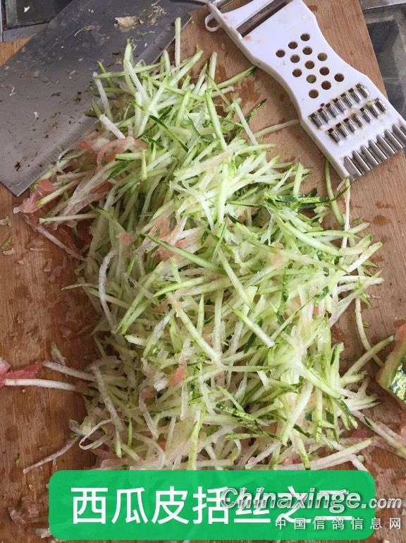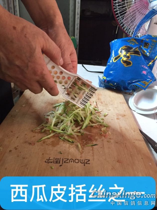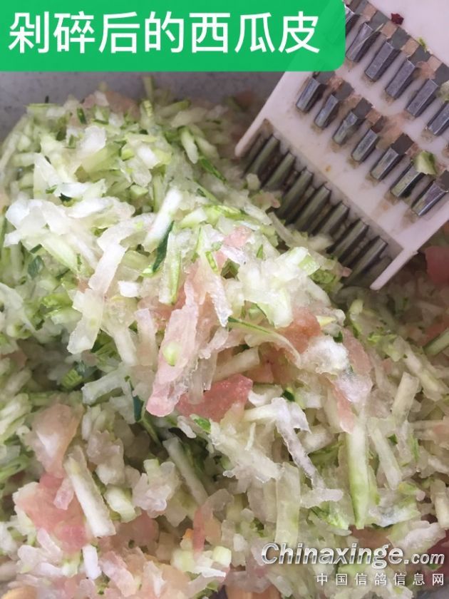 三、时鲜水果:西瓜皮清热解暑降温效果好,参照图片自己制作。先把西瓜皮做成丝,再用菜刀剁碎喂鸽,让其自由享用,晚上收取清理干净。此法可在三伏天气有效控制肠道和呼吸道传染病,起到排两便“大、小便”通淋的作用和很好的防暑降温效果。服后有立竿见影的表现,鸽子食欲大增,不管鸽粮多粗、细都不再挑食,那吃食的感觉就像饥饿的人伏在面包上一样。