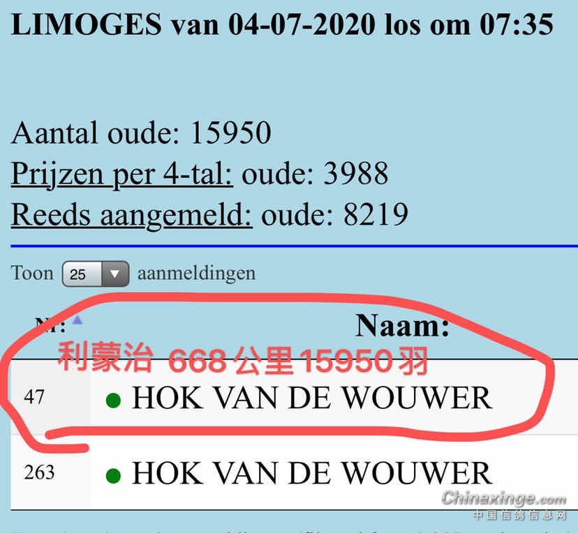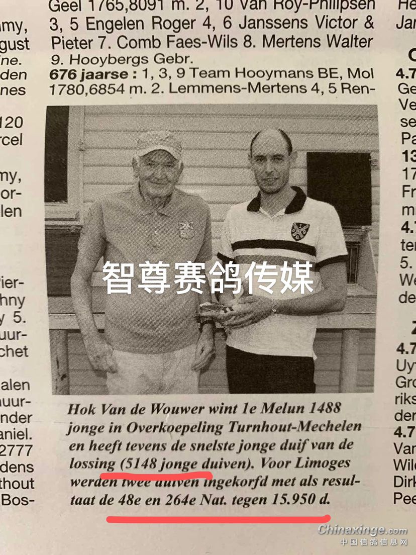 不仅仅只是300公里快!15950羽参赛的668公里的利蒙治国家赛也一样不含糊,老先生用盖比混血成功在长距离赛上高位入赏。前天,比利时、荷兰最大的deduif鸽报第一时间报道,葛斯顿父子荣获300公里5148羽冠军,以及利蒙治668公里15950羽全国48名、264名!