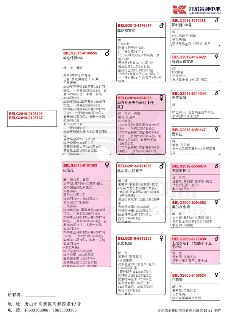 获得亚精顿I一岁鸽26085羽54位(BE-19-2125103)与88位(BE-19-2125167)的赛鸽,是亲兄弟,同时,它们还是波治I国家赛一岁鸽22506羽40位与萨布瑞斯458公里3350羽一岁鸽22位,出自配对【仟翼】直子×【灰薇儿】。