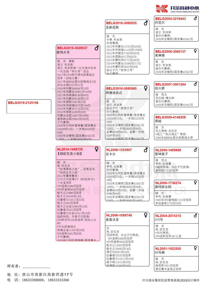 获得亚精顿I一岁鸽26085羽86位(BE-19-2125156)的赛鸽,出自【新伟大号】×【杨欧瓦克小姐】。