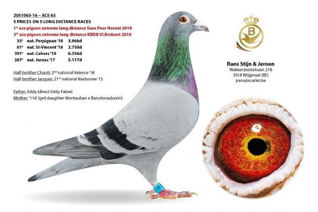 2019年巴塞罗那国际千公里大赛中,比利时兰斯·斯汀和耶罗恩的BE16-2051063灰雄,飞行空距1083.45公里,以944.61米/分的分速获得16051羽冠军。它领先亚军分速几乎达到75米/分,换句话说几乎领先2小时!这绝对是非凡的成绩。