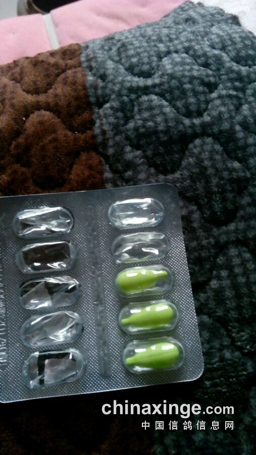 其他大家都知道的,就是清呼吸道——阿奇霉素、毛滴虫——甲硝锉,这些不多做解释,药店都能买到。清呼吸道,阿奇霉素每天四分之一片,连喂五天。甲硝锉也是四分之一,连喂五天。幼鸽出壳八天开始喂四分之一甲硝锉清毛滴虫,连喂四天。两种药不要同时喂,错开时间。