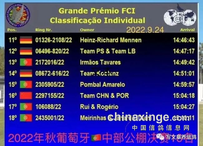 旅居葡萄牙的华侨鸽友叶学挺、龚成弟与国内鸽友叶正积、林民在葡萄牙组建的中葡赛鸽联队育出的赛鸽,在逆风中与国际众多鸽界高手在爱鸽云集的赛事里竞翔,喜获总排名19名、大奖赛16名的高位成绩,让祖国的五星红旗飘扬在欧洲赛鸽网里,令众多鸽友刮目相看。