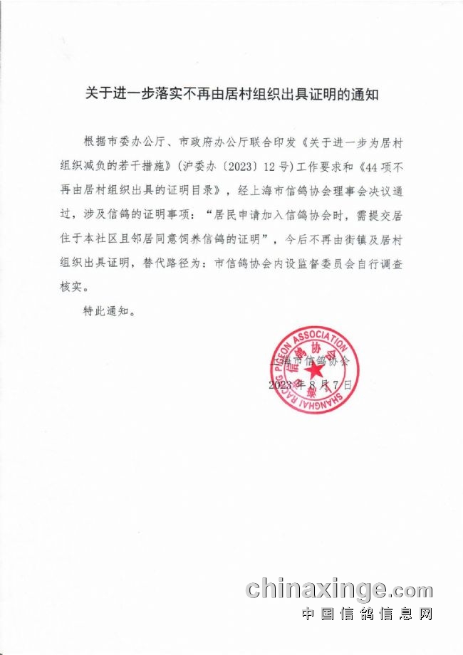 8月7日,上海市信鸽协会发布的通知中显示,居民申请加入信鸽协会时,需要提交居住于本社区且邻居同意饲养信鸽的证明。该证明不再由街道及居村组织出具,而改为市信鸽协会内设监督委员会自行调查核实。