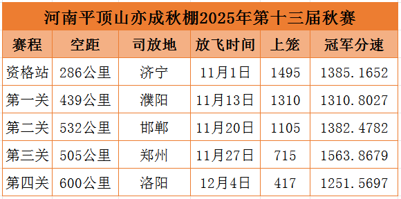 11月13日,439公里首关在濮阳鸣锣开战,集鸽1310羽,归巢率突破八成;11月20日,532公里二关于邯郸再燃烽烟,1105羽精英出征,近八成凯旋而归;11月27日,505公里三关在郑州开赛,715羽悍将启程,超七成顺利返巢。