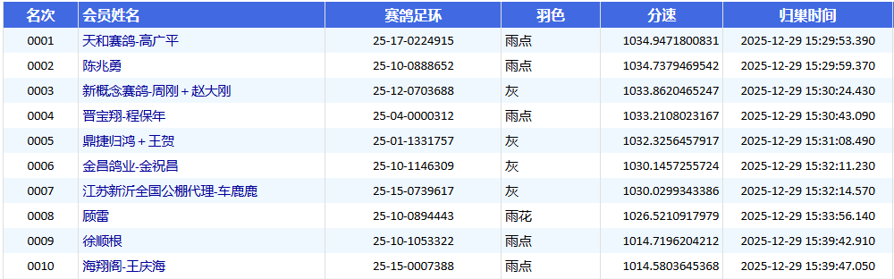 冠军鸽历经整整8小时飞行,才于于15:29:53报进。这羽雨点鸽出自天和赛鸽—高广平名下,足环号为25-17-0224915,平均分速达1034.9471米/分。亚军由陈兆勇的25-10-0888652雨点鸽获得,平均分速1034.7379米/分;季军则有新概念赛鸽-周刚+赵大刚的25-12-0703688灰鸽摘下,平均分速1033.8620米/分。