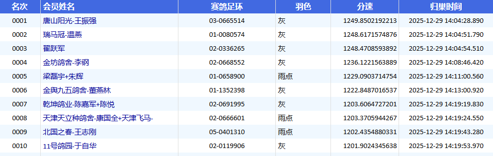 当天14点04分,第一梯队抵达,四羽赛鸽展开激烈毫秒之争。最终,唐山阳光—王振强的03-0665514灰鸽以1249.8502米/分的分速拔得头筹;瑞马冠—温燕的01-0080574灰鸽以1248.6171米/分位列第二;翟跃军的02-0336265灰鸽以1248.4708米/分夺得季军。