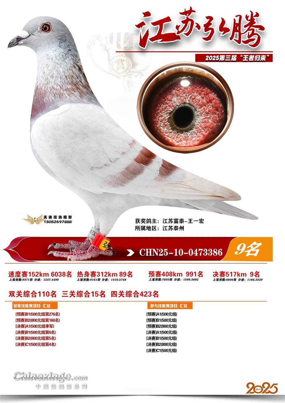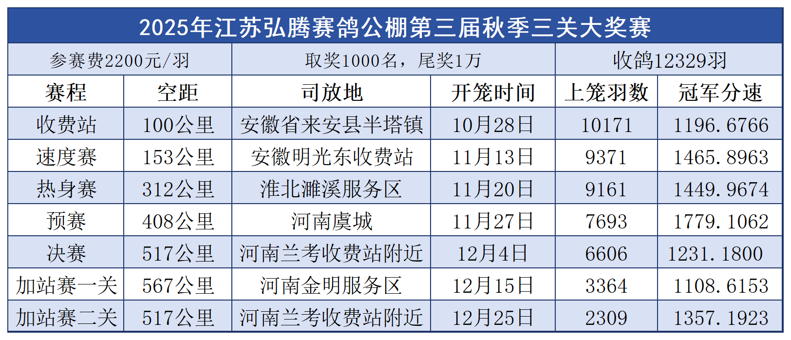 江苏弘腾赛鸽公棚加站赛单关前3名及综合1—10名