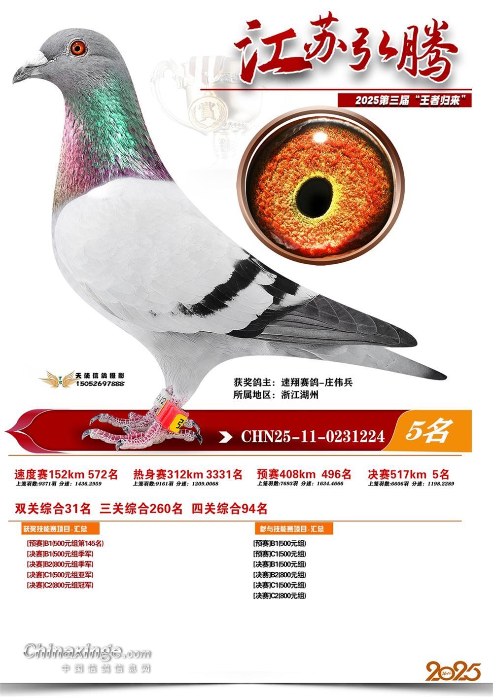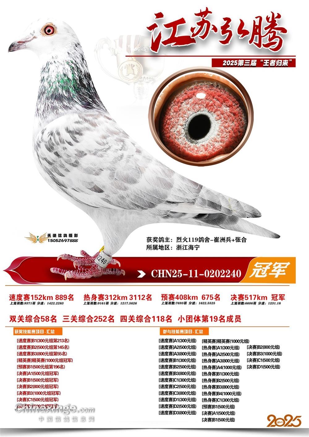 12月4日,本届秋赛巅峰对决在河南兰考收费站拉开序幕,6606羽战将向荣誉发起冲击。当日司放地天气晴转多云,赛线地形以平原为主,地势平坦开阔,无明显的地形阻碍。14点31分46秒,烈火119鸽舍-崔洲兵+张合名下环号25-11-0202240的麒麟花鸽率先归巢,以1231.1800米/分的分速力压群雄,夺得决赛冠军;仅5分钟后亚季军相继报进,整场赛事竞争白热化,仅一个多小时,一千获奖名额全部报满。三关鸽王排名也随之出炉,儀揚天翼-孙兰的25-10-0086884赛鸽凭借热身赛40名、预赛107名、决赛45名的稳定表现,荣膺三关综合鸽王冠军。钱永新的25-19-0789391赛鸽以预赛52名、决赛77名的亮眼战绩,斩获双关综合鸽王桂冠。