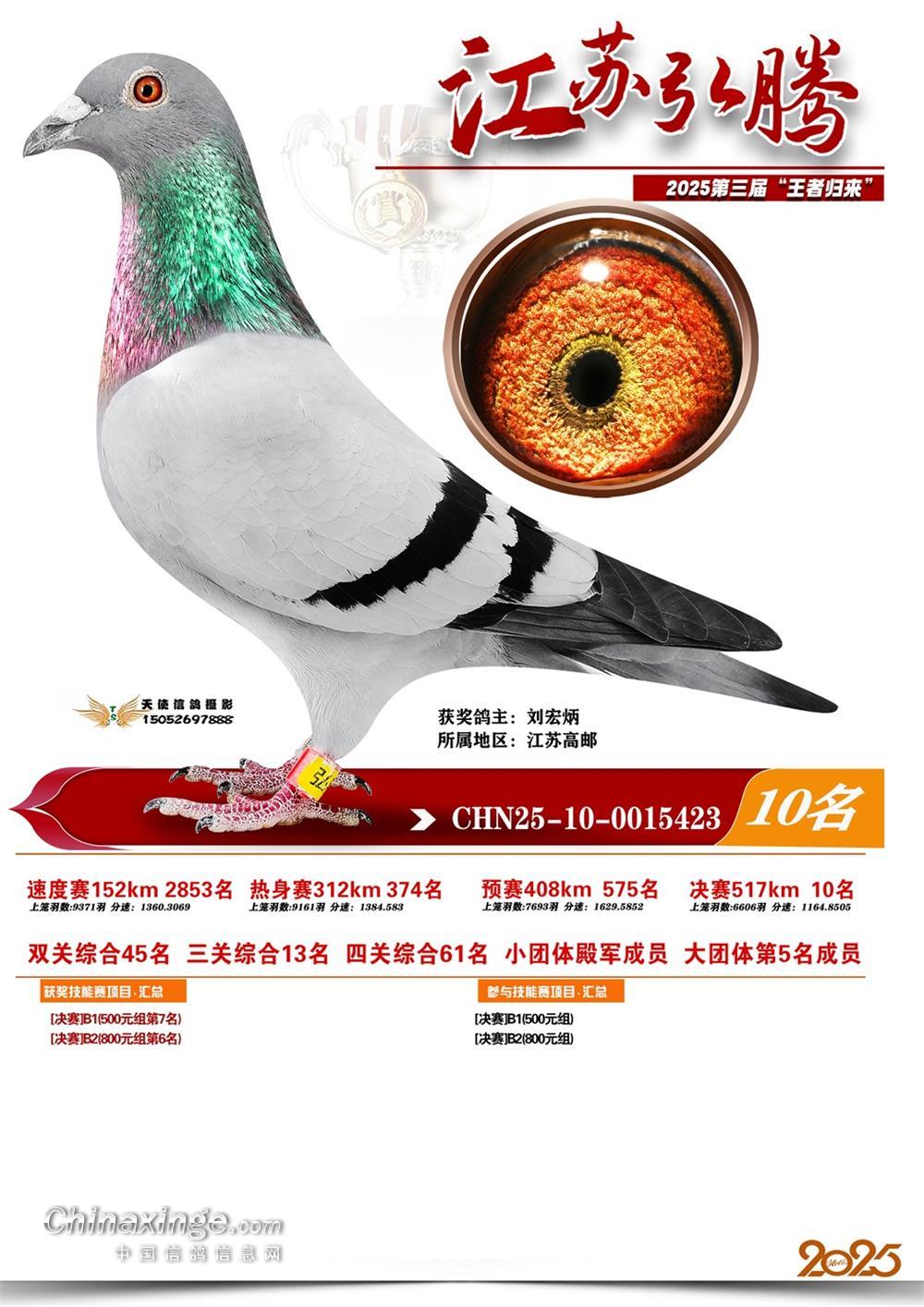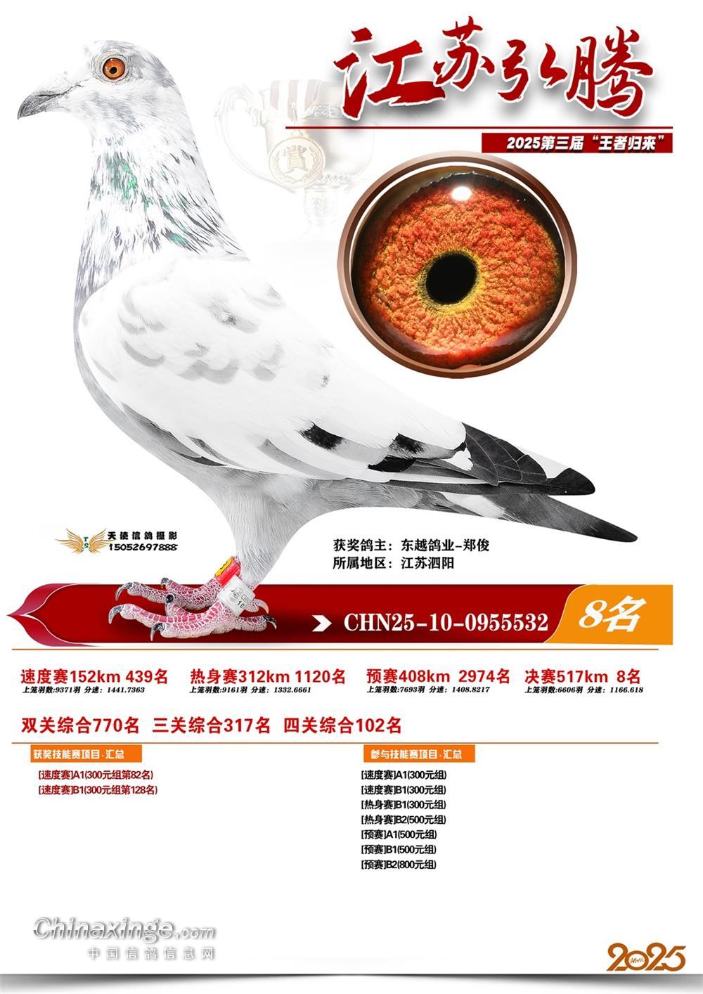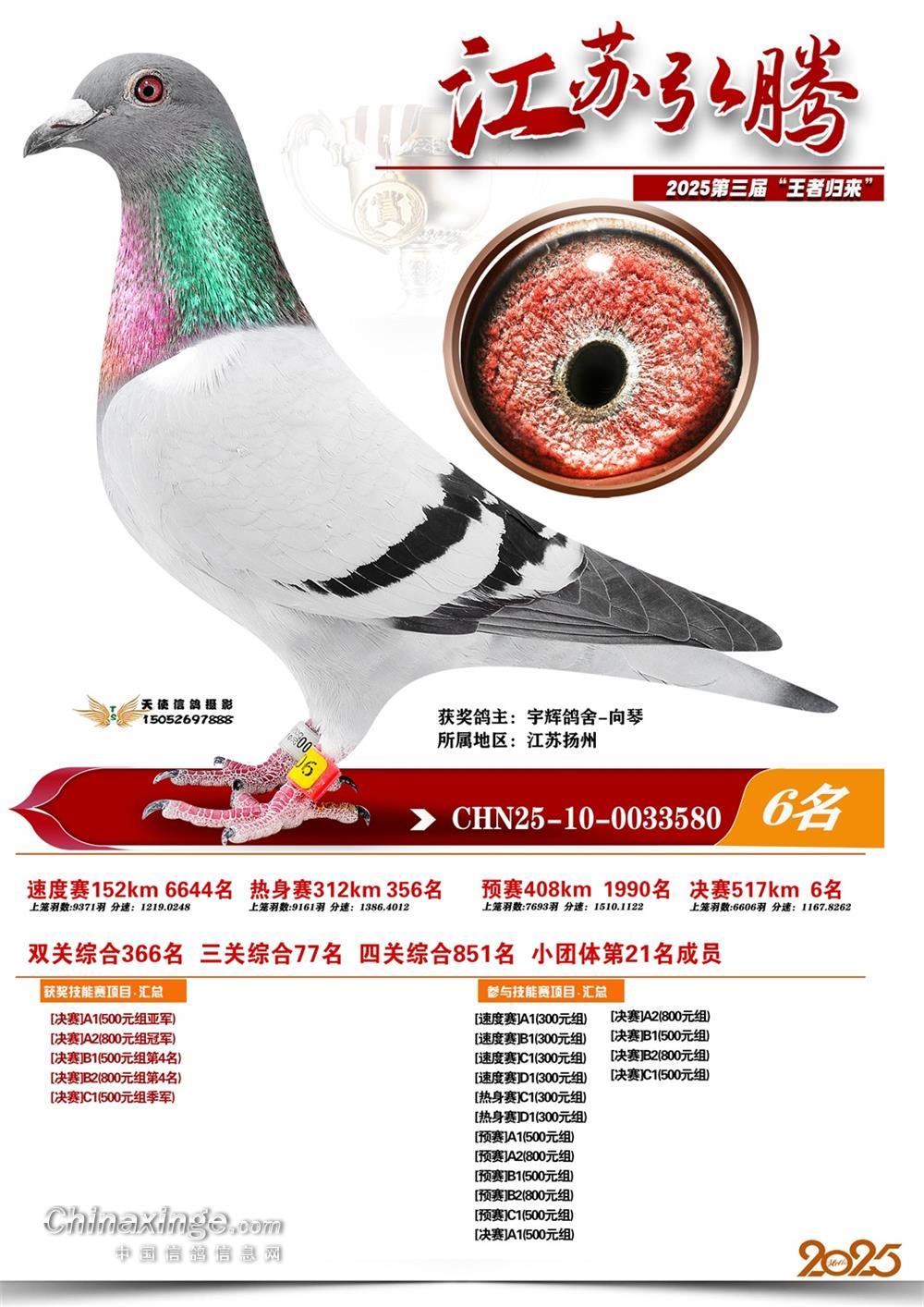 江苏弘腾赛鸽公棚2025年秋赛,走出一条以质促赛的赛鸽之路。今年参赛费2200元/羽,开奖羽数6500羽,决赛取1000名、前三奖励20万、15万、10万元,尾奖1万,丰厚回报参赛鸽友。10月28日收费站率先开笼,10171羽赛鸽出征归巢9571羽,94.1%的归巢率喜迎开门红;11月13日速度赛再攀高峰,9371羽参赛鸽归巢9164羽,97.79%的超高归巢率,既彰显了赛鸽的过硬素质,更印证了公棚科学养训与细致管理的专业水准,为后续三关正赛奠定坚实基础。