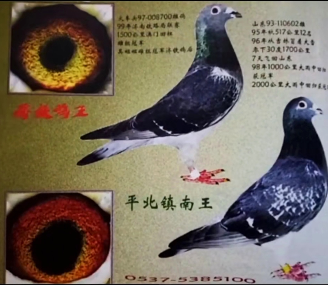 此鸽名为“平北镇南王”,是山东著名赛鸽名家杨传道所培育的一羽传奇种雄,其以“南北齐飞、长短兼优”的超凡表现闻名鸽坛。这羽战将出生于1995年元旦,同年秋季参加517公里湖北麻城赛事,一举夺得第12名。因此鸽血统优异、归巢迅速,故此杨传道当即决定将其留作种鸽,得名“麻城12名”。