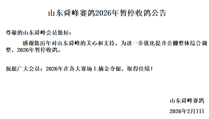 2月7日下午15点,山东舜峰赛鸽文化交流中心发布一则公告称,公棚将进行整体综合调整,故2026年暂停收鸽。