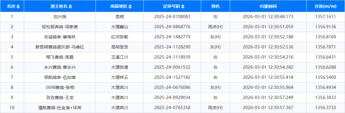 中午12时30分48秒,鸽友刘兴尧的2025-24-0108083灰鸽率先报进,分速1357.1611米/分,获得冠军。12时30分51秒,鸽友轻松哥养鸽-项家德的一羽2025-24-0868776雨点,紧随冠军身后归巢,分速1356.9136米/分,获得亚军。12时30分52秒,鸽友志诚鸽舍-崔海林的一羽2025-24-1482779灰鸽报进,分速1356.8169米/分,获得季军。截至开笼第二日上午10时50分,共报进1678羽赛鸽,归巢率48.27%。