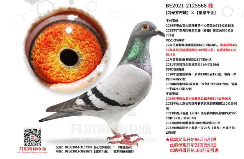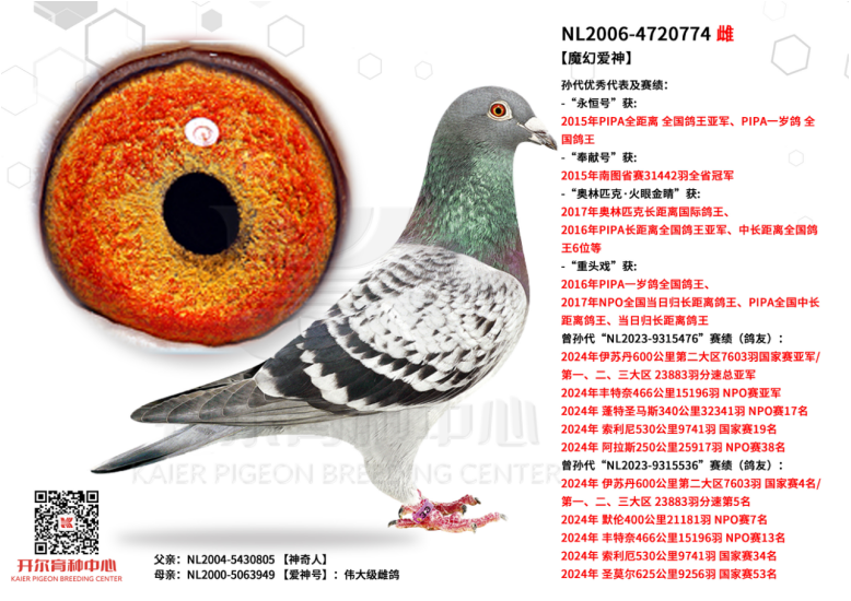 97名,母亲是盖比闪电号多重回血,源自鲁迪亲姐姐魔法女孩和宝拉两大殿堂级种雌,父亲是利奥12年KBDB全国速度幼鸽王冠军博尔特的近亲回血。