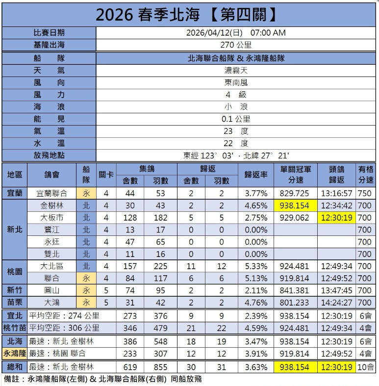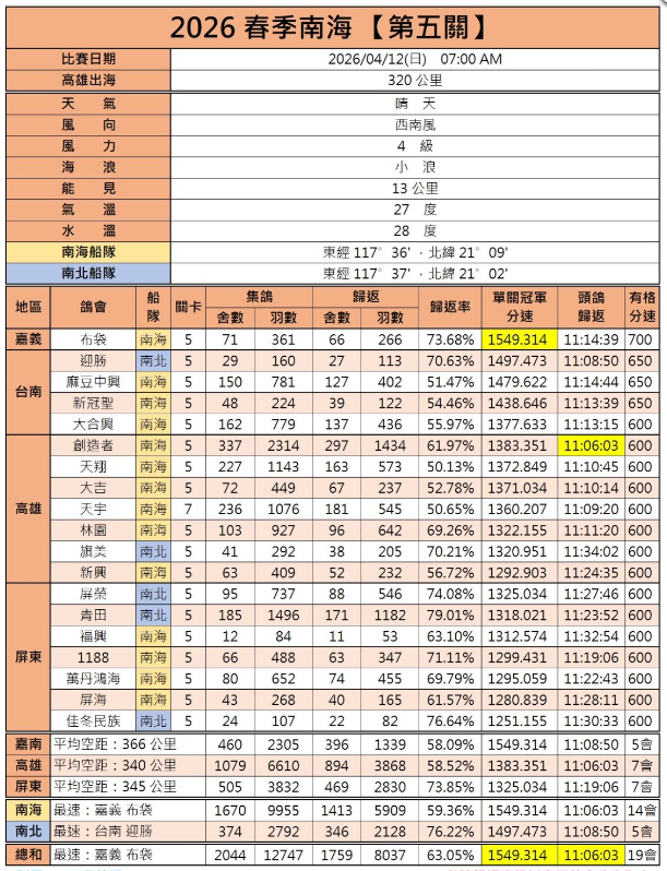 随着气温逐渐升高,台湾南海、北海的春赛也已经接近尾声。4月12日,南海、北海,同时开展最后一关的比拼。虽然是同日放飞,但因为天气状况不同,归巢情况也大相径庭。接下来一起来看看详细归巢情况。